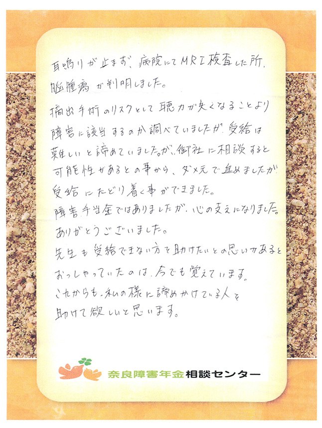 摘出手術のリスクとして聴力が失くなることより障害に該当するのか調べていましたが受給は難しいと諦めていましたが、御社に相談すると可能性があるとの事から、ダメ元で進めましたが受給にたどり着く事ができました。
