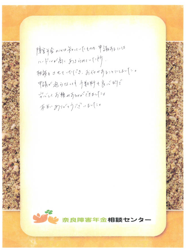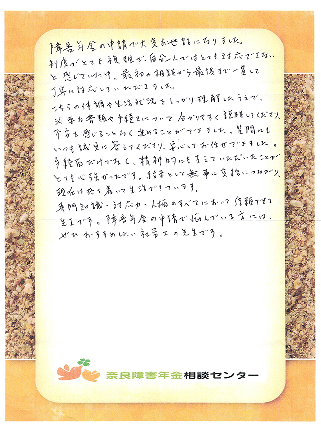 この度は、息子の障害基礎年金の給付申請にお力添え頂き誠にありがとうございました。
